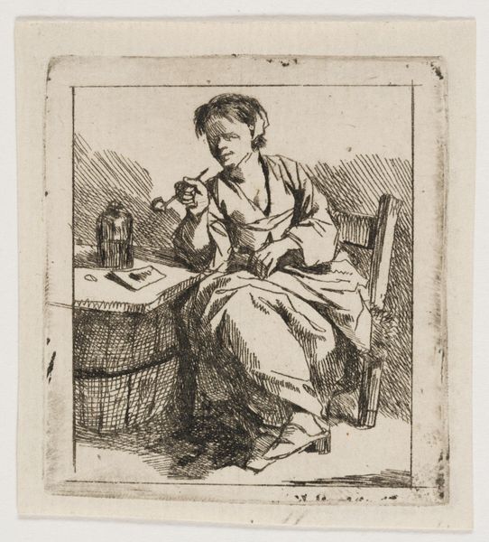 Editor: This is "Woman Smoking" by Cornelis Bega. The etching has an informal feel, and the lines seem to swirl around the subject. What strikes you most about its composition? Curator: The linear quality is compelling. Notice how the hatching creates tonal variation and suggests form. Observe the directional changes; how do they lead your eye? Editor: I see how the lines emphasize the folds of her clothing. It almost flattens the image, though. Curator: Precisely. The artist uses line not just to depict but to structure the entire visual field. It is a network of signifiers creating a distinct aesthetic experience, wouldn't you agree? Editor: I do now. I’ll definitely be looking at line differently.