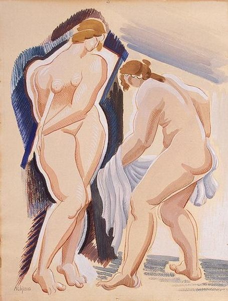 Editor: This is Rafael Zabaleta’s oil painting, “The Three Graces.” It features three nude women and almost has this kind of dream-like, surreal quality. I'm struck by how these women seem both idealized and very real. How do you interpret this work? Curator: This painting really brings up some interesting ideas around representation and the male gaze, doesn’t it? We’re meant to understand these figures as classical graces, but what happens when they are painted by a male artist with such…specificity? Consider how their bodies are rendered, how the 'naive art' style clashes with the classicising subject matter, and I think we can see a subtle critique of the objectification of women in art. Do you think that Zabaleta perhaps challenges that legacy through this work? Editor: That's a fascinating point! I hadn't really considered the contrast between the "naive" style and the classic subject matter. So, by portraying these figures in a less-than-idealized manner, he might actually be subverting the tradition of the nude in art? Curator: Precisely! And what about the painting within the painting, the artwork depicted on the easel behind them? That’s yet another layer commenting on the ways that we portray ourselves, and how complex it can be to escape existing tropes, especially those relating to women. Editor: That makes a lot of sense. I appreciate how you've placed this work within a broader dialogue of art history, while addressing contemporary theory about gender and identity. Curator: Art’s true value lies in sparking these kinds of crucial dialogues. Zabaleta offers a unique entry point, and the painting encourages viewers to see things differently and think critically. Editor: I definitely have a lot more to think about! Thanks so much.