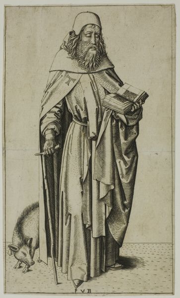 Curator: This is "Saint Judas Thaddaeus," a print by Master FVB, dating from around 1490 to 1500. Editor: The immediate impression is one of austerity; the etching's stark lines give the figure a monumentality, even if the overall presentation feels rather somber and austere. Curator: It’s interesting how the artist has chosen to depict Saint Judas. The book in his hand represents his role as a writer of one of the epistles, but that peculiar saw...well, tradition says he was martyred by being sawn in half. Editor: The saw becomes then not simply a prop but the ultimate tool, or weapon, of his martyrdom. I am drawn to consider what kind of labor went into creating this image. What presses were available, the types of metal, the production that supported the creation of the print, and by whom this print would have been acquired. Curator: Precisely. Consider too the cultural memory embedded within. He carries this association, willingly it seems, and it defines our reading of him, the knowledge of it being transmitted through these symbols, in effect the material culture of faith itself. This is powerful in its condensation of meaning. The halo is an obvious visual symbol for the spiritual purity expected from him. Editor: Absolutely. This also prompts us to contemplate access, right? A print like this, compared to, say, a panel painting, made the saint, his image, and by extension his qualities more available to the masses. It democratizes devotion. Curator: It certainly extends the saint’s reach, enabling private contemplation and acting as a memory aid. And the linear emphasis feels very northern European; that stark almost gothic line, makes you wonder about iconographic relationships north of the Alps, where visual traditions mixed and melded over centuries, retaining threads and innovating in others. Editor: Thinking about the labour intensiveness with early printmaking, where mistakes could ruin an entire run, reminds us about not only the skill and the vision of the artist but the importance of the artisan, and the economic systems that supported such production and the flow of imagery to be accessible to broader audiences, beyond simply the wealthy elite. Curator: In short, this Saint Judas encapsulates an intriguing interplay between visual symbol and accessible piety, reminding us of the enduring power of images. Editor: An object wrought from skill, devotion, labor, available for spiritual consideration and more widespread reflection.