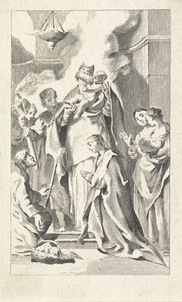 Dirck Volckertsz Coornhert created this engraving, “Door Blinde Begeerte en de hoop op rijkdom wordt de mens meegesleept”, sometime before 1590. The composition is dominated by a stark contrast between the rough, textured landscape and the smooth, idealized human figure struggling to climb. This contrast immediately draws the eye, creating a visual tension that speaks to the artwork's deeper themes. Coornhert uses line and form to construct a semiotic system where the arduous climb signifies the toils of human ambition, spurred by the promise of wealth. The figure's strained muscles, rendered with meticulous detail, highlight the physical and moral exertion involved in this pursuit. Meanwhile, the cherubic figure dangling a rope from above introduces a layer of complexity. The tension is palpable; the viewer is left questioning whether the pursuit of wealth is a divinely sanctioned endeavor or a perilous trap. The engraving's visual structure doesn't offer easy answers, but invites ongoing interpretation.