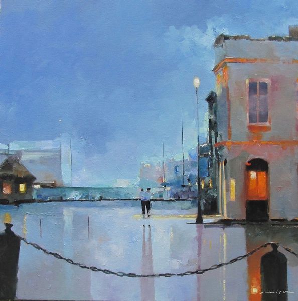 Editor: Right now, we're looking at "The English Way" by Jeff Jamison. It's an oil painting, a modern cityscape. It evokes such a quiet, almost melancholy mood... What do you see when you look at it? Curator: Well, I feel drawn into a drizzly afternoon. I love how Jamison captures that very specific light of a city after a rain shower - almost opalescent, reflecting everywhere. It's more than just a record of a street; it’s an emotional space. Look how the figures are slightly blurred; do they feel lonely or simply like components of an urban choreography? Editor: Urban choreography... I like that. The umbrellas certainly add to it. But the architecture seems so...stark, almost imposing. Curator: It does, doesn’t it? Those pale facades loom, but the wet streets and those crimson umbrellas soften the scene, giving a feeling of fleeting moments of connection within an environment that’s perhaps traditionally been seen as cold and hard edged. Do you think Jamison is suggesting we reconsider our relationship to these kinds of urban spaces? Editor: I hadn’t thought of it that way! It makes me consider the beauty in the everyday, even the dreary. I initially saw it as melancholy, but now there’s a sense of warmth. Curator: Exactly! And isn't that the joy of art? It transforms our perceptions, offers new angles. "The English Way" offers a reflective moment amid the rush, doesn't it?