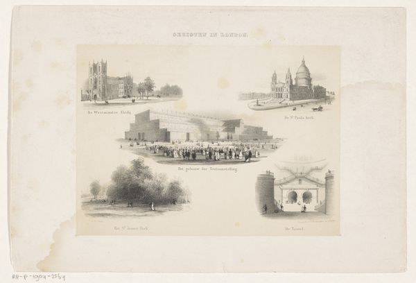 Curator: This is "View of Mariënbad with Eight Views of Prominent Buildings in the City," an engraving made around 1833 by an anonymous artist. The print gives us multiple vignettes of this developing spa town. It reminds me of souvenir handkerchiefs! Editor: Souvenir handkerchiefs for the fashionable elite who were probably sweating in their corsets as they 'took the waters.' It has this almost naive romanticism that makes me think of delicate, faded stationery, all whispers and polite coughs. What details strike you as a materials expert? Curator: What stands out is how the engraving medium transforms the depicted buildings and landscapes. Look at the linear precision. The density of lines creating shadows, and the way each small building gets flattened to a graphical element. Editor: True! There's this flattening that almost elevates it. Mariënbad isn't just a place but a stage, a perfectly designed experience. You know, it makes me consider the economics of leisure back then and who had access to it. Curator: Absolutely. The proliferation of such prints would contribute to constructing Mariënbad as a desirable location. Marketing through materiality! Mass production catering to an emerging tourism industry. The rise of the middle class enabled a consumer market keen to see these places! Editor: It does make you think about consumption... what did it *mean* to 'own' an image like this? A pre-digital 'I was there'? Did it conjure longing in those who couldn't afford it? I can feel its appeal even now. It reminds me, I should visit the thermal baths myself sometime. Curator: Precisely. It becomes a stand-in for lived experiences, shaping aspiration through accessibly reproduced images. This single sheet becomes the landscape that creates a myth of its own, and then invites a public! It almost doesn’t matter what the true site feels like…the work performs tourism, too! Editor: Ah, and so the original transforms again, becoming an eternal destination—not merely mapped but dreamt. Now that's what I call taking the waters to a different level!