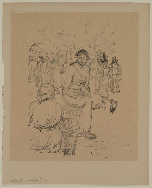 Curator: Here we have Max Liebermann’s drawing, "Strickende Mädchen," dating from around 1895. He created it using pencil and graphite. What strikes you most about this drawing? Editor: Immediately, the overwhelming sense of subdued concentration—almost a quiet solemnity, even though it's just two young girls knitting. The composition, with its minimalist background, heightens this effect. Curator: That quiet intensity seems fitting. Liebermann often depicted scenes of labor and leisure within working-class communities, exploring their everyday lives with an honest, unsentimental eye. Editor: True, but look at the texture. The varying pencil strokes build form and volume so efficiently. The hatching on the dresses creates a remarkable sense of depth and light. There’s a real tension between the sketchy quality and the defined details. Curator: Liebermann's work fits into the broader European art scene that responded to industrialization and urbanization by turning attention to social realities. He participated in an avant-garde movement to represent modern life as truthfully as possible. Editor: Yes, and he does capture the figures naturally, not overly idealized, caught in the midst of ordinary labor. It reflects an engagement with realism, no doubt. Still, my focus returns to that tonal range Liebermann achieves through the density of his pencil strokes; it lends an almost sculptural presence to the girls. Curator: Precisely, though we should remember that during this period the professionalization of female domestic work also began. These girls knitting represented not only leisurely craftwork, but essential contributors to familial economy. Knitting became more than just an occupation. It stood for an active contribution in providing clothes, nets and much more. Editor: That context deepens our understanding. The act of knitting is then not merely representation. Still, as an artist, Liebermann displays keen observation to achieve this powerful drawing through masterful command of pencil. Curator: And in doing so, Liebermann contributes to visual history. Editor: Quite, and offers a masterclass of technical precision.