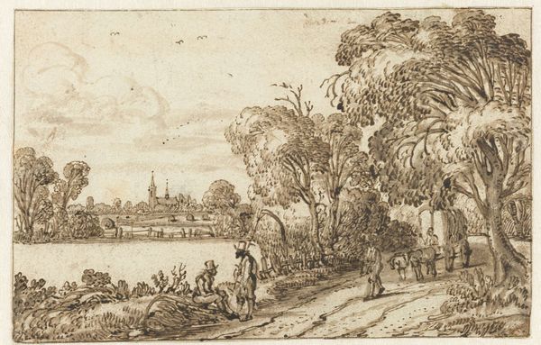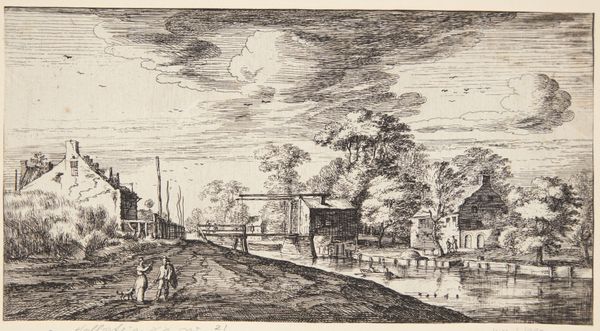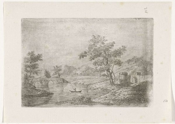 Editor: This is "River Landscape with a Ferry" from 1769 by Carel Frederik Bendorp, made using etching. It feels so calm, like a scene from a dream… sort of an idealized countryside view. What do you see in it? Curator: I see a quiet poem etched in lines, a meditation on the Dutch Golden Age even though it’s from a bit later. Imagine Bendorp, pencil in hand, breathing in that very air, feeling the breeze ruffle his wig perhaps! There's a simplicity here that whispers, doesn’t shout. Does it remind you of other Dutch landscapes? Editor: Hmm, I can see the influence, but it feels…smaller, more intimate than some of the big, dramatic canvases. It's like a snapshot of daily life rather than a grand statement. Curator: Precisely! It’s genre painting snuck into a landscape. The light isn't the star here; the everyday is. The cow on the ferry! That’s not something you see in a history painting, is it? Editor: No, definitely not! I guess I was so focused on the overall calm I didn’t notice the little stories happening. So, the appeal comes from the little details? Curator: Partly. But it's also about the artist's hand – those delicate lines suggesting depth, movement, the sheer ordinariness elevated by artistry. And that unassuming scene becomes surprisingly moving, doesn’t it? Editor: Absolutely! It’s much richer than I initially thought. Seeing how everyday life could be art…I'll be looking at prints differently from now on! Curator: Exactly, Art isn't about grandeur, it is about the art of seeing, isn’t it?