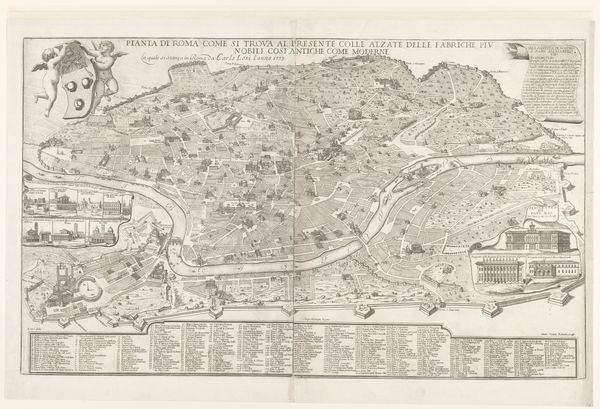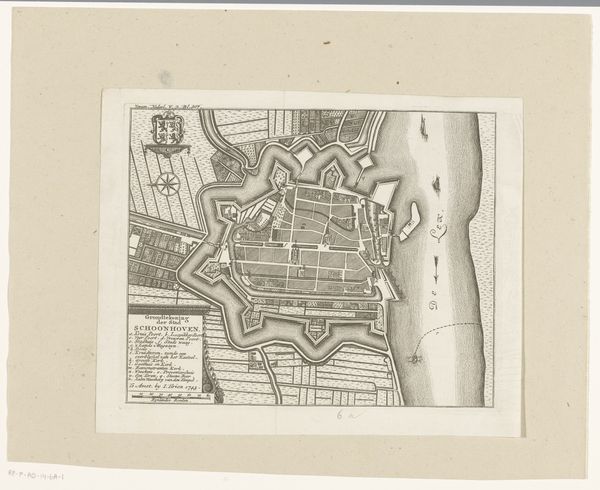Huibert Horneer made this print, "Spaanse schansen en Haarlemse verdedigingswallen tijdens het beleg van Haarlem, 1572-1573," using etching to capture a bird's-eye view of a historical siege. Rendered in monochrome, the composition is meticulously structured, dividing the scene into distinct zones of military engagement and urban defense. The precision in line work creates a textured surface, emphasizing the architectural and strategic elements of the siege. The artwork offers an opportunity to explore the formal organization of conflict through a structuralist lens. Horneer's detailed rendering serves as a semiotic system, where walls, fortifications, and troop movements operate as signs within a larger narrative of power and resistance. Notice how the ordered layout of the siege contrasts with the chaotic reality of warfare. This contrast highlights the print’s role not just as a historical document, but as a carefully constructed representation of spatial and military order. The formal structure of the print thus invites us to consider how representations of conflict can simultaneously reveal and conceal the underlying ideologies and power dynamics at play.