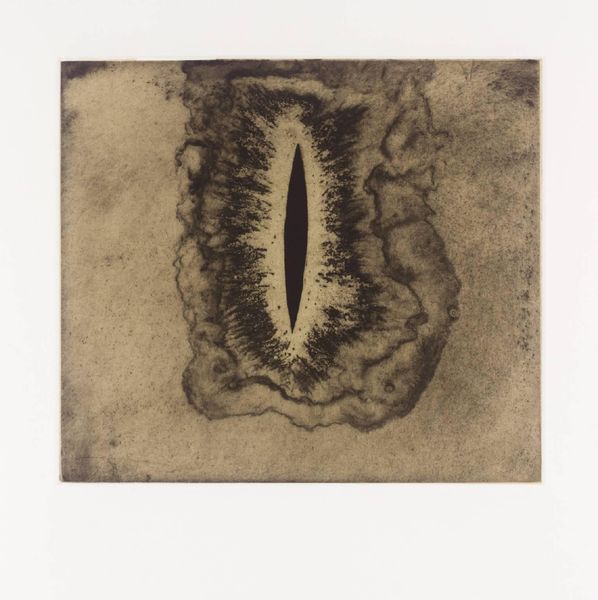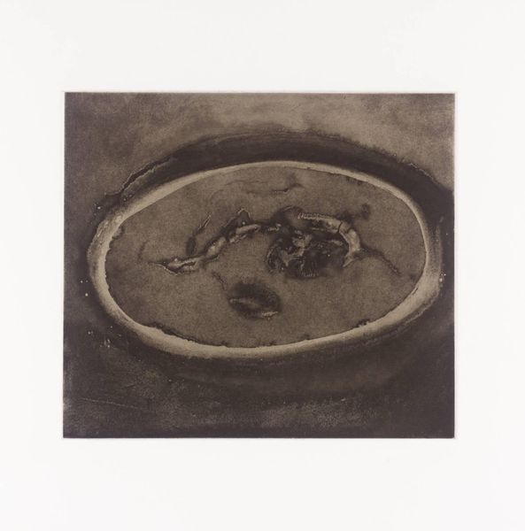 Editor: This untitled print by Anish Kapoor presents two dark, amorphous forms connected by a narrow point, creating a sense of tension and balance. What do you see in the composition and materiality of this work? Curator: The composition hinges on a precarious equilibrium. Note how the textures—the granular darkness against the smooth paper—create a tactile experience, almost as if one could feel the weight of the forms. Do you perceive a deliberate manipulation of light and shadow? Editor: Yes, the stark contrast between the dark shapes and the surrounding space really emphasizes their volume. It's like a study in pure form. Curator: Precisely. Kapoor's manipulation of form invites viewers to contemplate the interplay between absence and presence, challenging our understanding of spatial relationships. Editor: That’s fascinating! I'll definitely look at Kapoor's work differently now, focusing more on his manipulation of form and texture. Curator: Indeed, a deeper appreciation of abstract form is key to understanding Kapoor's visual language.