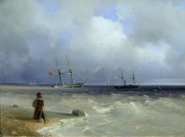 Ivan Konstantinovich Aivazovsky painted "Two Ships Anchored off a Beach" during the 19th century, a period marked by significant Russian naval expansion and imperial ambitions. Aivazovsky, who was of Armenian descent, lived through a time of complex cultural and political dynamics within the Russian Empire. In this seascape, we see not just ships, but symbols of power, trade, and perhaps, the often-overlooked human stories of those at sea and those left ashore. Two figures stand on the beach, their gaze drawn towards the ships as if contemplating voyages, or longing for home. Aivazovsky was quoted saying "The sea is my life". The turbulent sky and restless sea evoke the unpredictable nature of both maritime life and imperial pursuits, reminding us of the human cost and emotional weight behind grand historical narratives. The painting offers a glimpse into the intersection of personal experience, cultural identity, and the broader canvas of 19th-century maritime history.
