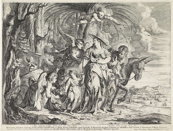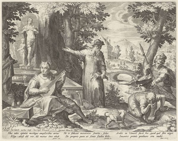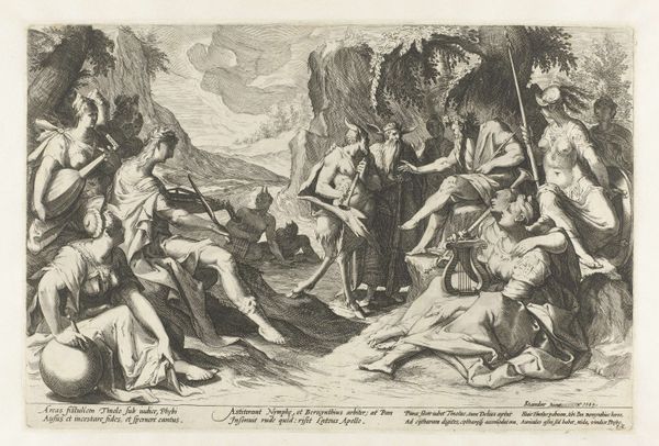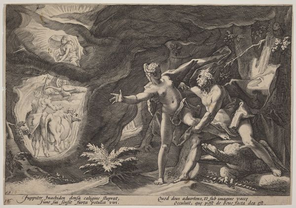 Curator: Immediately striking is the sense of unease; the sharp, almost frantic lines of the etching seem to amplify the distress etched on the figures' faces. Editor: You're absolutely right. Today we are looking at "Lot and His Daughters," an engraving and etching crafted in 1558 by Philips Galle, a prominent figure of the Northern Renaissance. It depicts a rather unsettling scene from the Book of Genesis, currently held in the Rijksmuseum collection. Curator: Galle masterfully uses line and composition to express movement. Look how Lot is centered but supported on either side by his daughters. Galle contrasts his central placement to his evident physical and emotional dependence on his daughters to survive this moment. Editor: Indeed. The print presents Lot as being rescued from the destruction of Sodom. In the background, we can still make out the burning city, a visual representation of divine punishment, whilst his daughters support him in a cave offering wine. Curator: The expressions on the figures are truly captivating. The daughter on the left almost steels herself. This is contrasted by the other, who is already partially reclined. Both cling to Lot; their expressions suggest less concern and more sinister intent. Editor: Galle, working during the rise of print culture, played a vital role in disseminating biblical stories and moral allegories to a broader public. Prints like this allowed narratives and interpretations to circulate widely, influencing social and religious understandings. The Mannerist style contributes a sense of dramatic intensity through elongated figures. The story touches upon themes of sin, salvation, and familial loyalty, made potent through Galle's skill with the engraving tools. Curator: There’s an almost dreamlike quality in the combination of precise detail, the almost ornamental drapery set against the violent scene depicted in the background. The detail contrasts the uncertainty and, as you pointed out, dramatic action central to the print. Editor: Looking closely, we can admire the artist's sophisticated handling of textures—the smooth skin, versus the coarse fabric. It draws the eye, making it a rich experience. The interplay contributes to an atmosphere that is, indeed, intensely compelling. Curator: A lasting piece then, both for its formal execution and the glimpse into societal values and concerns of the 16th century. Editor: Precisely. It's a stark portrayal, demanding our attention still, centuries later.
