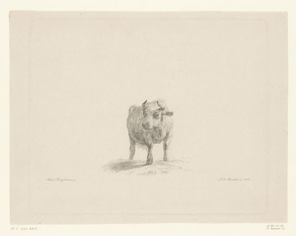 Editor: We’re looking at "Griseso," a lithograph by Lorenz Frølich, dating sometime between 1820 and 1908. It’s a remarkably detailed print of a pig, almost clinical in its realism. It’s a straightforward depiction; what aspects stand out to you? Curator: The strength of this lithograph lies in its tonal range, achieved through a mastery of line and texture. Observe how Frølich uses hatching and stippling to articulate the volume and surface of the pig. The careful variations in density suggest a deep understanding of light and shadow. Note the deliberate placement of the subject in the pictorial space and how the negative space influences how we understand the lines. How do these elements work to construct meaning? Editor: I see what you mean about the shading creating volume. The tail, in particular, uses only a few lines but it does create the image of a curl. Are you suggesting that, despite the subject, Frølich is drawing our attention to his artistic skill rather than the pig itself? Curator: Precisely. Consider the work's surface qualities; it is not an attempt at perfect mimesis. The print is not trying to trick us into thinking it's a real pig, or to even deliver a clear, singular message. It presents a calculated and deliberate artifice of the medium. Notice the composition itself: the blank space heightens our engagement with the lines creating the image. The pig's very *pig-ness* seems beside the point. Editor: So, rather than interpreting the meaning behind the image of the pig, we should be looking at how the artist uses line, shading, and composition to create an image? Curator: Yes, indeed. The essence of this piece, for me, resides not in the subject it depicts but the formal elements and structural relationships. Editor: This has been a great way to expand how I view representational works; to look beyond the object and into the methods the artist employed to make the piece as impactful as it is. Curator: I concur. Focusing on these structural relationships enriches our experience beyond surface level comprehension.