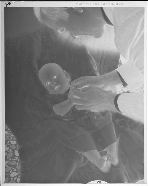 Editor: This photograph, "Untitled (woman holding baby)" by Lucian and Mary Brown, shows a woman from behind, holding a baby. The high contrast makes the image quite striking. What do you see in this piece? Curator: It’s interesting how the artists chose to depict the woman from behind, denying us a direct gaze. It could be a commentary on the often invisible labor of motherhood and caregiving, especially within the context of mid-century gender roles. What does the domestic setting suggest to you? Editor: I hadn't considered it that way. Seeing it as a representation of unseen labor shifts my perspective. Curator: Exactly. The absence of the mother's face forces us to consider the social and political implications of this everyday act of care. It also hints at broader questions about who gets to be seen and whose stories are told. Editor: I appreciate your insight into the social context; it gives the image a powerful new layer.