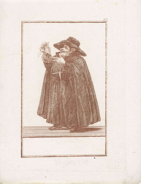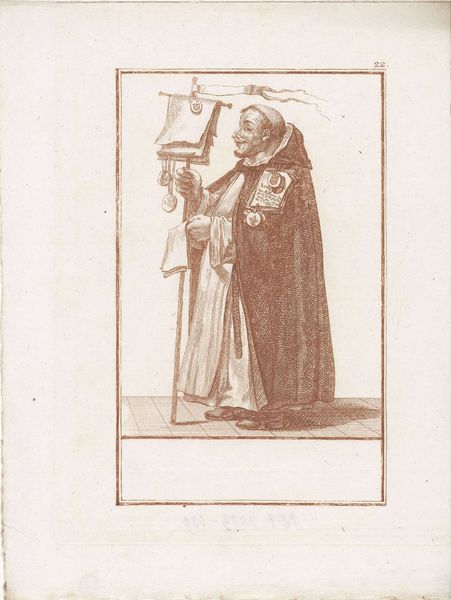 Curator: Jacob Gole’s engraving, from around 1724, is titled “Dikke monnik met de sleutels van hemel en aarde,” or, in English, "Fat Monk with the keys of Heaven and Earth." It resides here at the Rijksmuseum. Editor: Oh my! The instant vibe is… slightly unsettling, almost darkly humorous? I'm struck by the figure, weighed down – almost literally shackled – by those enormous keys! There's an almost absurd quality to the composition. Curator: Absolutely. The engraving's success is partly due to its clever material presentation. We can see the etched lines create tone and texture, essential to conveying a sense of the monk’s substantial weight, both physical and symbolic. Editor: Symbolism being? Those keys seem less about opening doors and more about representing burden of religious authority, and isn't that a scapular around his neck? He’s like a caricature of earthly and heavenly power, struggling under the expectations! The lines around his face… each wrinkle feels like a year of hard-won but compromised… wisdom. Curator: Well observed. Baroque prints like these often played with popular archetypes. Gole capitalizes on a rising interest in satirical portraits which allowed for public questioning of status, but more interestingly, increased engraving production. Editor: It feels deeply human, but not in a sentimental way. The cross-hatching of lines almost looks like… layers of earthly troubles mapped on skin! It's a masterclass in subtle rebellion conveyed through skillful manipulation of the material—the ink and plate. How radical for the time. Curator: Gole's use of line in this engraving really does prompt us to reflect upon the processes of image-making itself and to consider prints not merely as copies, but as primary sites of aesthetic innovation, shaped by economic, and even socio-political forces. Editor: Right! Thanks to Jacob Gole's craft we aren't just looking, we're considering, feeling the weight. A brilliant and very human piece of work.