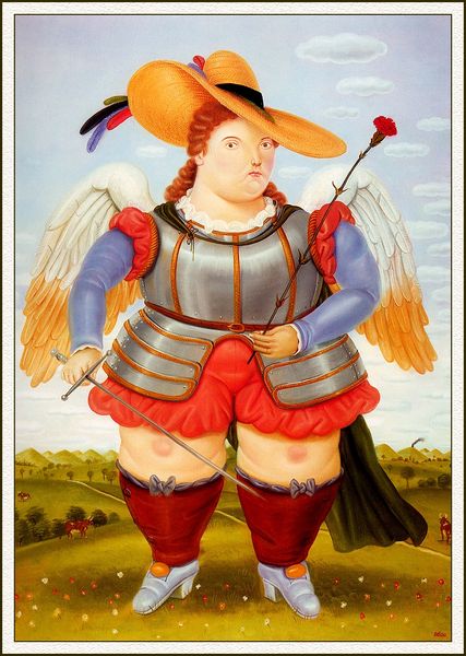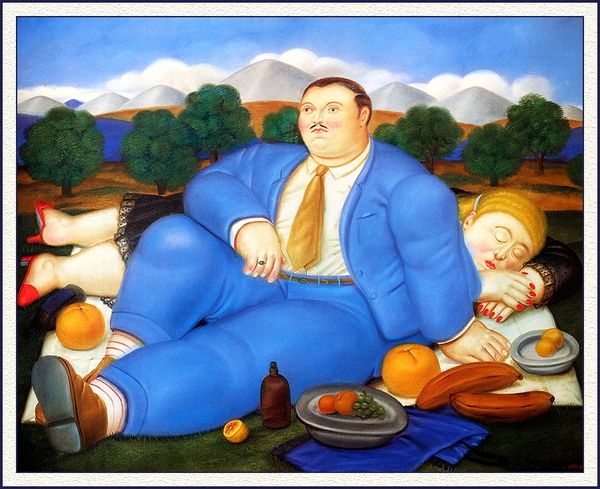 This is Fernando Botero's 'Tour of the Volcano,' and it looks like it was made with oil on canvas. The first thing I see is how Botero is using a limited palette to create a whole world. Look closely at the paint itself. It's smooth, almost like skin, which makes the figures feel both present and a little unreal. Botero’s trick is to make figures that are monumental, but also kind of soft, like they could deflate if you poked them! The tiny red shoes and delicate flowers feel like a humorous contrast to the imposing figure. I'm reminded of other artists who play with form and volume, like Gaston Lachaise or even Philip Guston, who knew how to make seriousness and humor dance together. It’s a reminder that art isn’t always about answers, but about keeping the conversation going.