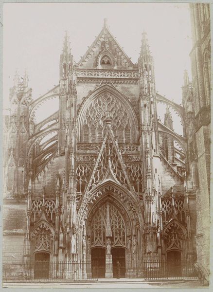 Edmond Bacot made this albumen silver print, titled Saint-Maclou, Rouen, capturing the gothic architecture in the mid-19th century. During this era, photography emerged not only as a medium for documentation but also as a lens through which social structures and cultural values were both reinforced and interrogated. Bacot's choice to focus on a religious monument invites us to consider the role of the church in shaping the cultural identity of the French people. How does the grandeur of the architecture contrast with the intimate street view? The photograph serves as a historical record and as a piece of art that provokes questions about how we engage with our cultural heritage. Consider how this image creates a dialogue between the past and the present. What does it mean to preserve and represent historical monuments through photography?