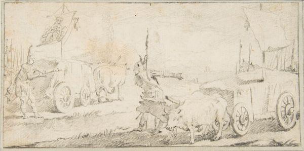Editor: Here we have Jan van Goyen's "Cattle Drivers and Cattle on a Slope," created between 1630 and 1633, a pen and pencil sketch held at the Rijksmuseum. It’s such a simple scene, but the composition, with the livestock climbing that little hill, feels quite powerful somehow. What do you see in this piece, especially considering the historical context? Curator: What strikes me is the seemingly mundane subject matter elevated through van Goyen's keen observation. This piece comes from a time when the Dutch Republic was experiencing immense economic growth and social change. Did this "elevation" democratize the concept of painting? Did it serve to record new social stratifications? Editor: You mean because it wasn't a typical aristocratic or religious scene? Curator: Precisely. Landscapes and scenes of everyday life gained popularity. This drawing suggests a growing interest in depicting the rural, working class and the land itself as a source of national identity and pride. This contrasts sharply with the grand historical or mythological subjects favored in other parts of Europe. What role did the Rijksmuseum serve during this period? Editor: Well, it wasn't around then, but I think what you’re saying is it tells us a lot about Dutch society and its values during that period. Curator: Exactly. This sketch, unassuming as it is, speaks volumes about the evolving patronage and social functions of art. Van Goyen captures a slice of life that reflects a changing society finding beauty and value in its own surroundings. Editor: It's fascinating to consider the political and social weight carried by such a simple pastoral scene. I guess art really is never just about the surface. Thanks for helping me unpack this! Curator: My pleasure! Analyzing art this way lets us understand how art reflects and shapes its historical moment, enriching our understanding of both.
