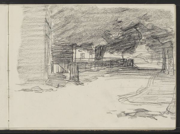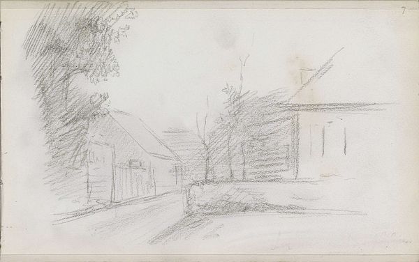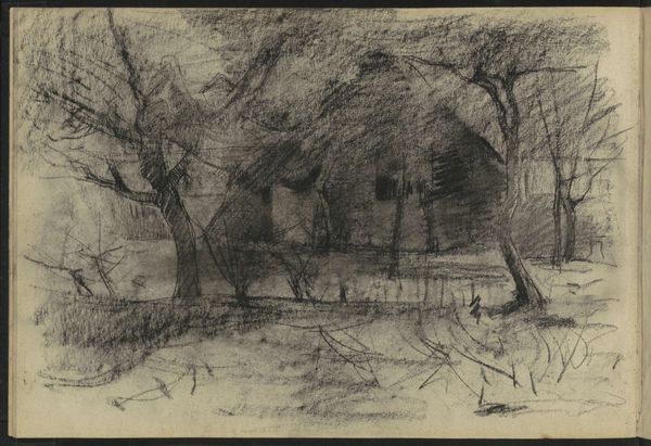 This drawing, "Landschap met bebouwing," was created by Louis Apol and is currently held in the Rijksmuseum. Observe how the composition of the landscape is structured by the gestural qualities of the charcoal medium. The building and nature around it are constructed out of multiple strokes, lines, and smudges. The lines create a sense of depth and volume, while the smudging gives the artwork a soft and hazy quality. Note the strategic use of these visual elements that guide the eye, creating movement and rhythm across the surface. We can interpret this technique as a reflection of the artist's subjective experience. Rather than aiming for a precise representation, he seeks to capture the essence of a moment through the materiality of the medium. The open-ended, interpretative qualities invite us to engage with the artwork on a sensory level and consider how the formal elements shape our perception and understanding.