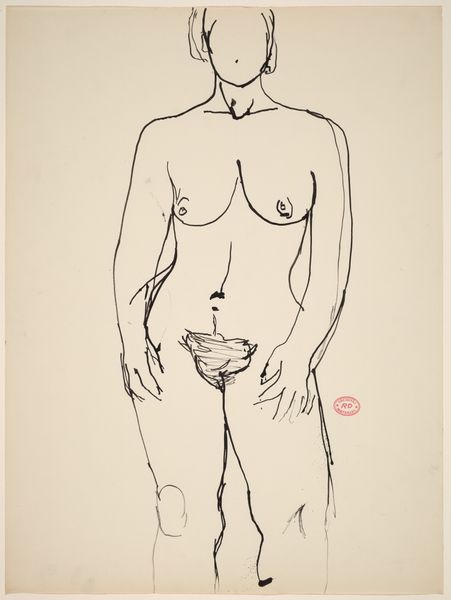 Editor: Here we have Richard Diebenkorn's "Untitled [female nude]," created sometime between 1955 and 1967 using ink on paper. It has an almost unfinished quality to it, quite raw in its execution. What social commentary might Diebenkorn be making here? Curator: I think you're right to focus on the raw quality. It invites us to consider the shifting representation of the female body in the mid-20th century. Was Diebenkorn challenging traditional, idealized nudes? The very act of displaying the "unvarnished" form, moving away from classical beauty, speaks to evolving social attitudes about sexuality and representation. How do you think the medium, ink drawing, plays into this? Editor: I see how ink, being so immediate, suggests an attempt to capture something authentic, as opposed to a highly rendered oil painting. But was there any kind of art-world reaction to this type of approach? Curator: Absolutely. There was a tension. The academy still prized skillful realism, while a growing segment of artists and critics were pushing for more subjective and expressive forms. Think about Abstract Expressionism blooming at this time – did this influence the perception of Diebenkorn's work? Editor: That makes sense. With Abstract Expressionism dominating the scene, maybe figurative work like this was read as either a rejection of it or, perhaps, a new way of understanding the figure within abstraction. I’m starting to appreciate how art exists in conversation with these movements and socio-political shifts. Curator: Precisely. The conversation continues, even to today! Seeing this piece anew is rewarding for me as well.