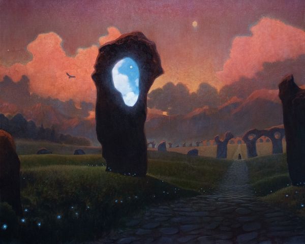 Curator: Before us, we have an Untitled tempera painting on matter by Zdzislaw Beksinski, created in 1978. Editor: The overall impression is definitely unsettling. The somber palette, the stark verticality of the forms...it evokes a sense of post-apocalyptic desolation. Curator: Let's consider Beksinski's process. His technique of layering tempera on matter – essentially, building up the surface – creates a tangible, almost sculptural quality. The visible texture emphasizes the material reality, the very "stuff" of this world. Editor: Indeed. The interplay of light and shadow across these forms—the stone pillars and the human figures on them—highlights their monumental yet desolate quality. The vertical lines command a striking perspective; it draws the eye upward but to nowhere. The whole visual rhetoric speaks of grand structures stripped of meaning. Curator: Beksinski worked during a time of political turmoil in Poland. Consider this desolate landscape as a commentary on social upheaval, the decay of ideology and institutions. Perhaps these are remnants of a lost civilization. Editor: From a purely compositional perspective, the symbolism is fairly apparent. Those clusters of dark figures atop the structures can easily suggest isolated pockets of humanity struggling against a featureless, unforgiving environment. It does elicit a strong emotional response. Curator: I agree. It’s worth remembering Beksinski refused to title his pieces to encourage personal interpretation. These recurring images may hold private symbolic significance rooted in his life and surroundings. His conscious rejection of explicit narratives allows for an almost unbearable degree of ambiguity. Editor: The starkness and abstraction invite personal reflection. It certainly leaves you with the haunting sense of absence or lingering dread. Curator: It’s the tangible materiality combined with allegorical and symbolic interpretation that delivers the work's visceral impact. Editor: An apt assessment, it invites contemplation long after one turns away.