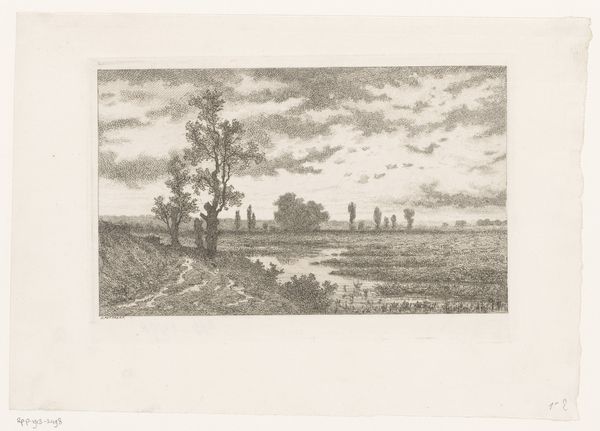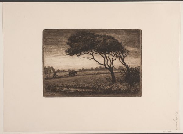 H. Gerner Lund created this etching titled ‘Landevej på Amager’ around the turn of the century, a period of significant social and artistic change. Lund, who lived from 1850 to 1900, was working in a time where artists were increasingly turning their attention to everyday life and the changing landscapes around them. This image captures a road in Amager, a Danish island, with a simplicity that belies the complex relationship between land and identity. The trees leaning in the wind suggest a struggle, a bending but not breaking, a sentiment that resonates with the period’s shifting societal norms. The road itself, etched with fine lines, invites us to consider themes of travel and connection but also of isolation. Lund's choice to focus on this landscape, devoid of human figures, suggests a commentary on the individual's place within the broader environment. There is a quiet melancholy here, a sense of nature persisting despite human presence. It encourages reflection on our own paths and how we navigate the spaces we inhabit.