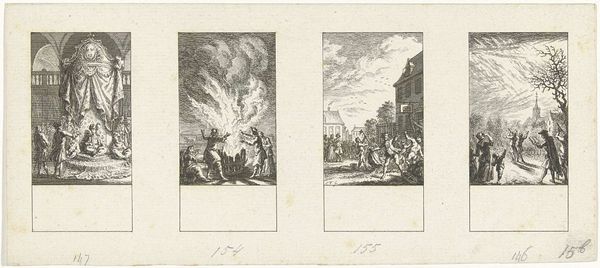 Simon Fokke made this print, depicting four months of the year, using etching. Prints like these were common in the Netherlands during the 18th century, and were primarily produced for an expanding middle class. They reflected the cultural values of the time, emphasizing the importance of seasonal activities and observations. The print offers us a glimpse into the social rituals associated with different times of the year: October may refer to the autumn harvest and November to Saint Martin's day. February might be a bonfire and the theatre depicts March. We need to ask questions to find out the context of this image. As historians, our job is to dig deeper, to unearth the meanings that might have been clear to Fokke’s contemporaries. We could look at period literature, almanacs, and other visual sources to understand the symbolism embedded in these monthly representations. By understanding how these images were made, circulated, and received, we can gain a richer understanding of 18th-century Dutch society and the role of art within it.