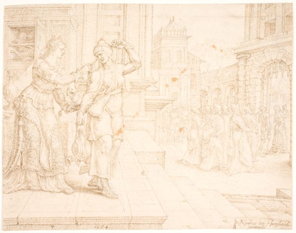 Curator: At first glance, there’s something unsettlingly calm about the drawing; the chaos rendered in delicate lines almost makes it more… unnerving. Editor: That’s a good starting point, the piece is titled “Israel bliver delt mellem Omri og Tibni” - which translates to Israel divided between Omri and Tibni. Maarten van Heemskerck completed it in 1568, we believe. It's an etching, currently residing here at the SMK. The story it depicts is a historical power struggle, yes, but those fallen, ruined pillars surrounding the crowd… that feels deliberate. Curator: Oh, absolutely! Ruin becomes such a potent visual symbol for political and societal decay in early modern prints. Look how Van Heemskerck juxtaposes the relatively orderly lines of soldiers with the crumbled architecture. It’s not just background scenery; it’s commenting on the fragility of power. Editor: Right! And the crowds on either side, flanking Omri and Tibni – figures symbolic not only of loyalty but also, perhaps, of societal division itself. That stark contrast. You feel the weight of their divided loyalties. Those flags, they pierce through the architecture! And if you zero in on those soldiers in the foreground... they almost feel crammed into the scene. A feeling of barely-controlled tension? Curator: You're onto something. There's a visual compression going on. All that detail, meticulously etched…but toward what end? Is he glorifying power or dissecting the psychological mess of conflict? The helmets especially – the strange details of them are a kind of... well, psychological armour. Editor: It’s almost as if the meticulous detail becomes overwhelming. Looking again I see these pen sketches are trying to teach me how humans organize themselves with heraldry and battle strategies, and its almost ungraspable. What is left? The psychological elements emerge? Curator: Van Heemskerck definitely packed this scene with narrative layers, prompting questions about not just political history but psychological responses. Thanks for giving this your insight! Editor: A pleasure, it just looks like how our brains process a crisis doesn't it? I really did come to love that.