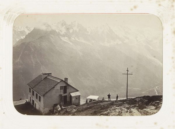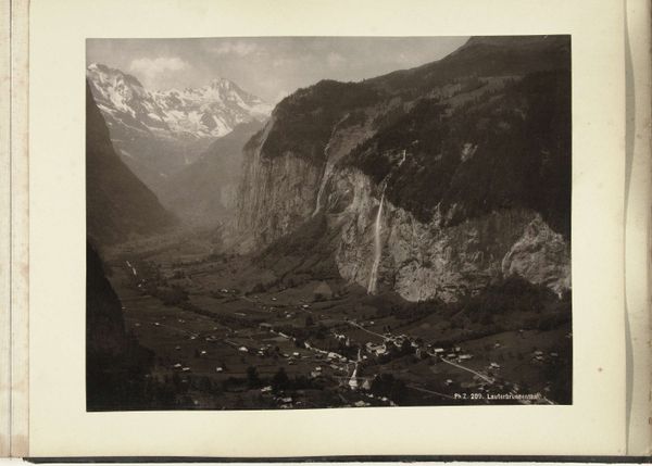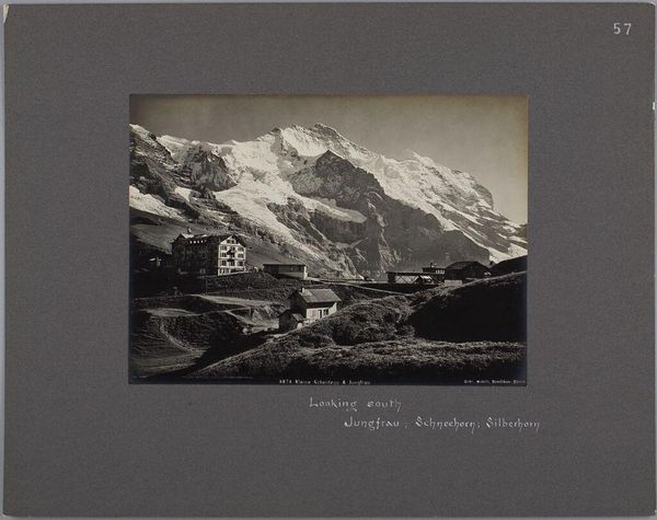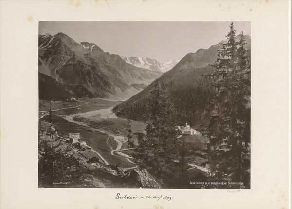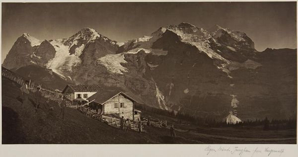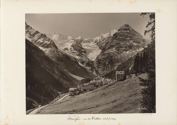 Editor: This photograph, "From Trafoi, looking S. by E.," is by the Bachrendt Bros. It depicts a village nestled in the Alps. There's an imposing grandeur to the landscape. What draws your eye in this composition? Curator: The way the village feels dwarfed, almost a fragile human imposition, against the monumental, glacial backdrop really resonates. It makes me think about our fleeting existence compared to the geological timescale of the mountains. Doesn't it evoke a sense of sublime insignificance? Editor: It does! I hadn't considered the geological timescale. It definitely adds a layer of depth to how I perceive the image. Thanks! Curator: My pleasure! It's all about seeing beyond the surface, isn't it?