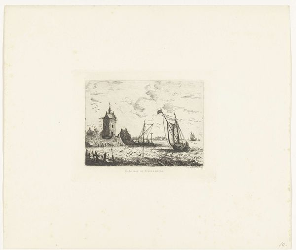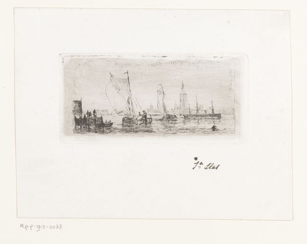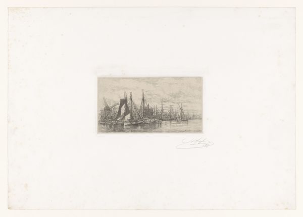 Curator: Today we are looking at “Zeilschepen op zee”, or "Sailing Ships at Sea", an etching from 1877 by Henri Seghers. What are your first thoughts on this image? Editor: It feels rather melancholic, despite depicting ships at sea, which typically evoke ideas of adventure and exploration. There is a stillness, a grayness, that gives it a somber mood. Curator: I find it interesting that you say that, as etchings like this one were widely produced in the late 19th century. The multiplication of images like these speak to broader societal changes— the rise of consumer culture and the accessibility of art. The etching process itself allowed for a greater distribution. Editor: But these sailing ships are potent symbols, don't you think? They reflect maritime trade, navigation and naval power – timeless concepts rendered fragile here by the etching medium. They are almost ghostly. Is this some symbolic elegy of a bygone maritime era? Curator: The question isn't necessarily what they symbolize, but who these prints were for. Perhaps the growing middle class with newfound purchasing power and the taste for these picturesque scenes? Editor: It cannot be just about consumers. Seghers chose to depict sailing ships – archetypes of exploration and trade since antiquity. Ships speak of aspirations, potential. Each vessel becomes a signifier charged with longing. The hazy sea evokes ambiguity and mystery. Curator: But by focusing only on symbolic interpretation, aren't we overlooking the very real impact of mass-produced images? What about the materiality, the techniques of reproduction, and the network of economic exchange that enabled these images to circulate so widely? We shouldn't disconnect this from how the artist did the work; each ship becomes a part of a mechanical enterprise in artmaking and society at the time. Editor: I will concede there's no single way to consider art, though in our discussion of sailing ships, Seghers invites more contemplation about man’s relationship to the sea than mass manufacturing of prints, wouldn’t you agree? Curator: Possibly, though the materiality of the piece leads down an exciting path too. This etching reflects the shifting economic tides of its era!