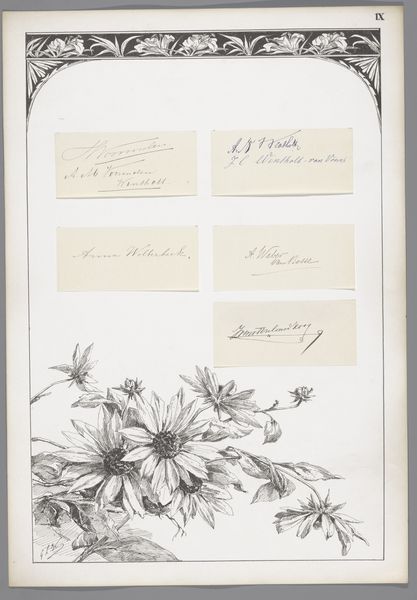 Editor: Right now, we're looking at "Acht handtekeningen geplakt op een blad met irissen en decoratieve rand," or Eight Signatures Pasted on a Sheet with Irises and Decorative Border, created in 1904. The artist is George Lourens Kiers. What strikes me most is the delicate balance between the formal signatures and the organic iris illustration. It feels almost like a secret garden of names. What do you see when you look at it? Curator: Ah, yes, it’s like stumbling upon a Victorian-era scrapbook, isn’t it? Imagine each signature as a tiny portrait. Notice how they’re not randomly placed; they seem to float amongst the irises. The decorative border at the top acts like a proscenium arch, framing this quiet performance of handwriting. I’m curious, does it remind you of anything? Perhaps an autograph book? Or something else? Editor: It does feel very personal, almost like a preserved memory. So, is the artist presenting the signatures as works of art in themselves? Curator: That's a thought! Perhaps Kiers was captivated by the individuality of handwriting. Each signature tells a story, hints at a personality. The irises, often symbols of hope and wisdom, might be whispering secrets about these individuals. Or it could just be a decorative arrangement. Who were these people? Why were their signatures so important? That's what I find fascinating – the questions it provokes. It's a tiny time capsule, isn't it? Editor: Absolutely. I’ll never look at a signature the same way again. Curator: Nor will I. I love that these glimpses from the past make us think about the layers of connection—what remains visible and what we'll never know.