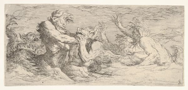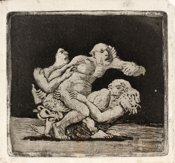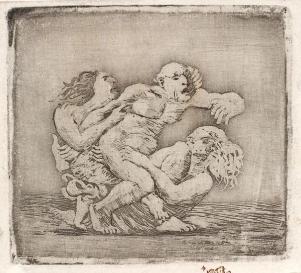 Oluf Hartmann made this print, ‘Two Women Fighting Over a Man,’ sometime around the turn of the 20th century. This disturbing image presents raw human desires, and the struggle for power within relationships. It could also be seen as critiquing the commodification of love in a rapidly changing society. Hartmann was a Danish artist, and his choice of printmaking aligns him with a broader trend of artists using accessible media to engage with social issues. The stark contrast and crude lines emphasize the violence of the scene, while the lack of background focuses our attention on the bodies, stripping away any romantic notions of love. Hartmann may be using a social commentary to reflect his own anxieties or observations about the changing dynamics between men and women in Danish society. To fully understand Hartmann's intentions, we might look into the social debates and artistic movements of his time. The study of sources such as feminist writings or the artist's biographies, can shed light on the cultural context that shaped this provocative image.