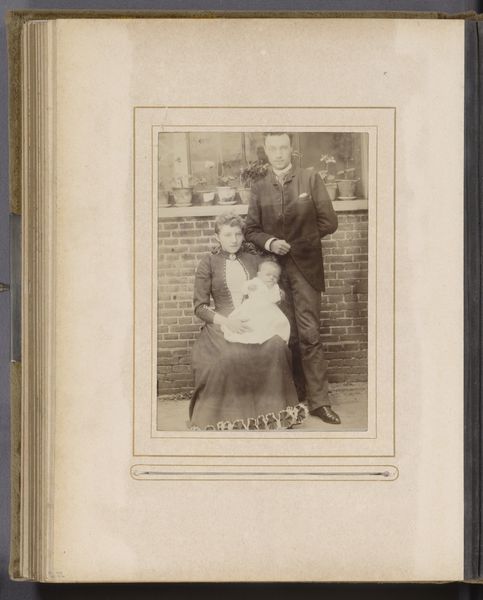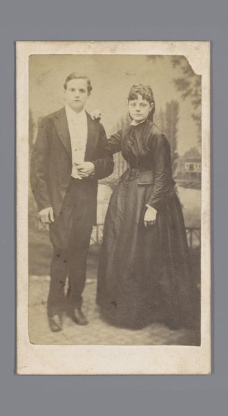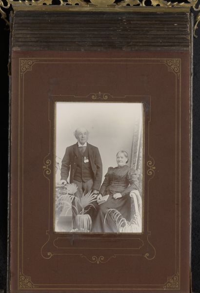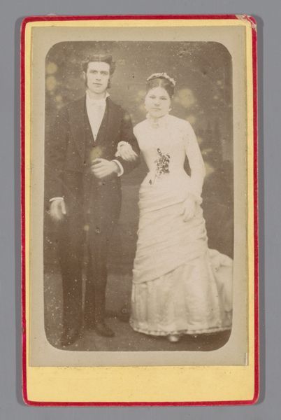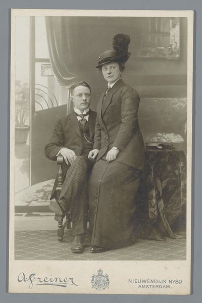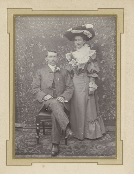 Editor: This is "Portret van een onbekend echtpaar in trouwkleding," or Portrait of an Unknown Married Couple in Wedding Clothing. It's a photograph, dating from around 1910 to 1925. What strikes me is how posed and formal they seem. What can you tell us about its cultural context? Curator: It's interesting to consider how studio photography like this reflects social expectations and aspirations. During this period, photography became more accessible to the middle class. A wedding portrait wasn't just a memento; it was a public declaration of status and respectability, a way to participate in modern visual culture. Editor: So, it’s less about capturing candid joy and more about societal performance? Curator: Precisely. Think about how the backdrop is carefully arranged, and the couple are posed rigidly to convey an image of permanence and stability. They aren't smiling. The museum itself plays a vital role here, because displaying it impacts our understanding today, moving it away from a simple document of the past and transforming it into a tool of cultural preservation, raising the image to "art". Where do you think it might have been taken and hung at the time? Editor: I guess it would probably hang in their house, as a constant reminder for themselves, maybe in the living room. Maybe they would display it in their office to show respectability? That makes me think of how we display our own wedding photos now – often it’s the perfectly curated Instagram shot. Is this photograph, in a way, similar to today’s Instagram culture? Curator: Absolutely. There's a continuous thread of visual representation tied to identity, but mediated by available technologies and platforms. This photograph, like an Instagram post, participates in constructing and projecting an image of the self, albeit within its own specific historical framework. Editor: This has been a super helpful look into how this picture works as a product of culture! Thanks so much! Curator: My pleasure. It’s a good reminder of how even seemingly simple images carry significant social weight.