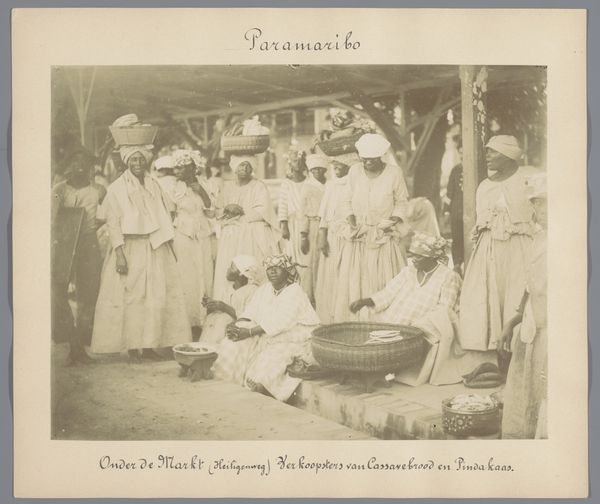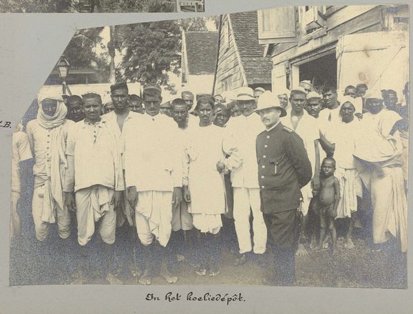 Gomez Burke captured this image, titled 'In het immigrantendepot,' with a camera at an unknown date. The photograph shows a group of Indian immigrants standing in front of a wooden building, presumably the titular immigrant depot. The image creates meaning through the visual codes of colonialism. The immigrants are dressed in simple, traditional clothing, while the European official stands out in his uniform and pith helmet. This contrast highlights the power dynamic between colonizer and colonized. The photograph documents the system of indentured labor, known as the "coolie" trade, which brought Indian workers to various parts of the world, including Suriname, where Gomez Burke worked. This image may reflect the complicated politics of imagery in colonial contexts. Was it intended as propaganda, or did it critique the exploitative conditions of indentured labor? Historians can gain greater insight into the artwork by researching the photographer's biography and studying the social and political history of Suriname during the period in which the image was created.