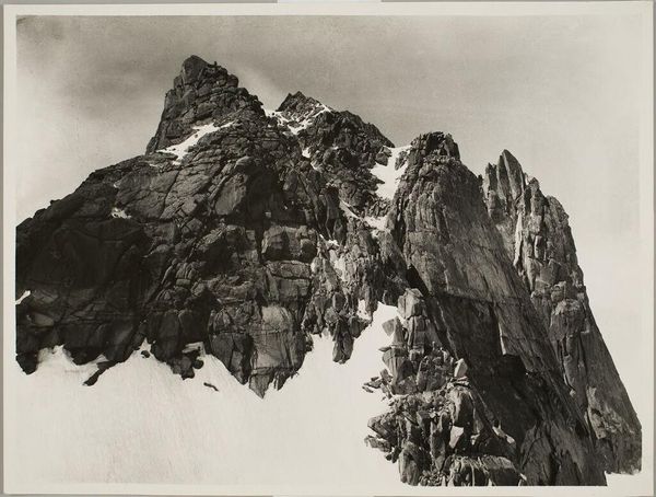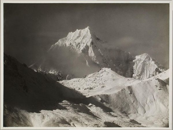 Editor: This stunning photograph, "Gasherbrun Range, Karakoram" by Vittorio Sella, is impressive! The stark contrast between the dark rocks and brilliant snow is striking. What can you tell me about it? Curator: Consider the conditions for producing this image. Sella lugged heavy photographic equipment to document these peaks. This was arduous labor, a deliberate process far removed from our instantaneous digital photography. Editor: So, the physical effort is part of the art itself? Curator: Precisely! The materiality of the photograph—the paper, the silver—speaks to a specific era of exploration and image-making. It's not just about the view; it's about the means of capturing it. Editor: That gives me a new appreciation for the photograph. Curator: Seeing the art in the labor and materials changes everything, doesn't it?