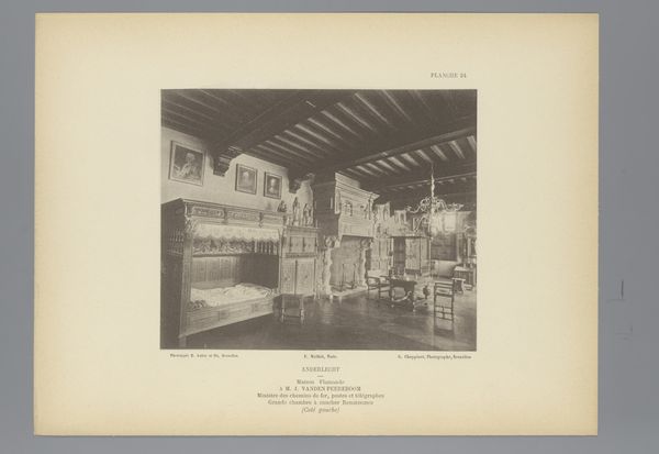 Curator: This print, predating 1898, presents a view of the bedroom in the house of J. vanden Peereboom in Anderlecht, Belgium, captured through the lens and photographic expertise of G. Choppinet. Editor: It’s undeniably somber. The tonal range is limited, creating a stark atmosphere. There's a deliberate use of rectilinear forms—the bedframe, the ceiling beams, and the heavy fireplace structure—all conspiring to create a closed-in sensation. Curator: I see it also as a testament to Flemish craftsmanship, a representation of domestic life and, perhaps, the professional status of J. vanden Peereboom— a member, as the title suggests, of the ‘chemins de fer,’ the railways, of posts, and telegraphs. Look closely at the textures captured. What do they suggest to you about materiality and domesticity? Editor: The textural quality is key. The coarse texture of the bed linen against the dark, presumably wooden frame, offers an interesting contrast. Note the objects carefully placed on the mantelpiece: those shapes could inform a comprehensive taxonomy, reflecting social values encoded in domestic artifacts. Curator: Precisely. Consider the social context of a member of those important unions immortalizing their domestic space in photographic print; what statement do you think they are making? Was there a performative aspect to its crafting and display for a middle class viewer? Editor: It has an undeniably devotional element, particularly with that crucifix so prominently displayed near the bed, mediating what must be very dark corners and, perhaps, one’s very dreams. Curator: Indeed. And consider the implications of photographic printing as a method. Printmaking allowed for distribution beyond the domestic sphere of the railway, posts, and telegraph member, enabling the dissemination of images of domestic Flemish life, as viewed through his lens. Editor: Yes, and ultimately, it's the print’s compositional severity and the sheer materiality of its dark tones which convey what strikes me as a powerful and stoic image. Curator: Seeing how our viewpoints interweave—from social implications and labor practices to structural interpretations—shows that this still photo harbors a diverse history, no? Editor: Absolutely. Even a single room speaks volumes across the decades through these analytical frames.