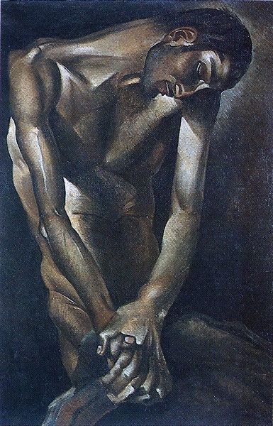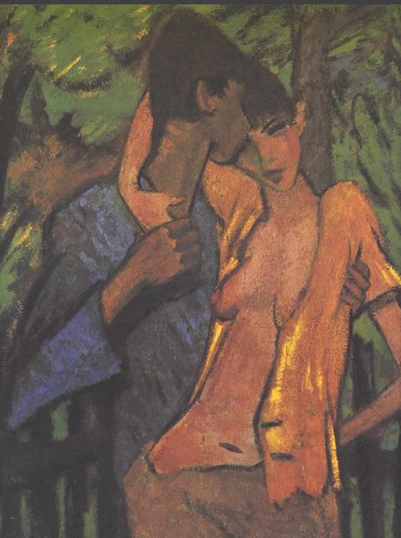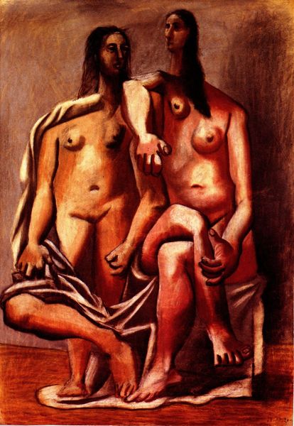 Art Historian: Editor: Editor: This is “Two Friends,” painted by Pablo Picasso in 1904, using oil on canvas. It’s predominantly blue. I find it quite melancholic and haunting because of the color. How would you interpret this work from a formal point of view? Art Historian: I see your point. The overwhelming blue monochrome indeed sets a certain tone. From a formalist approach, consider how Picasso uses this limited palette to create form and space. Observe the way the slightly varied shades of blue sculpt the figures, giving them weight and presence. Where do you see successful modelling and less successful modelling of the forms? Editor: I think the modeling around their faces and hands works really well, especially on the woman on the right – the shadows are much stronger on the planes of the face and that directs our eyes to her expression. But lower down, it flattens out a little bit – like the space between them seems undefined. Is it a cohesive composition? Art Historian: That contrast is key. Notice how the interlocking of the two figures creates a complex, almost ambiguous spatial relationship. Is it deliberate? Is he purposely obscuring parts to leave them up for our interpretation? Consider how the painting’s strength is not about depth but on flatness, challenging traditional perspective. What affect do you think that has? Editor: I guess it adds to the mood - making it seem almost dreamlike because it is harder to place them in space, more surreal maybe? It focuses the attention on the subjects’ emotional states, instead of the environment. Art Historian: Precisely. Picasso is using formal elements—color, form, and composition—not merely to represent figures but to evoke an emotion, or even disrupt conventional modes of viewing. Through these disruptions the viewing and ultimately its meaning becomes open-ended. Editor: That’s a great point. Focusing on those choices, and not what the subject matter "should" represent really opens up the possibilities in the painting.