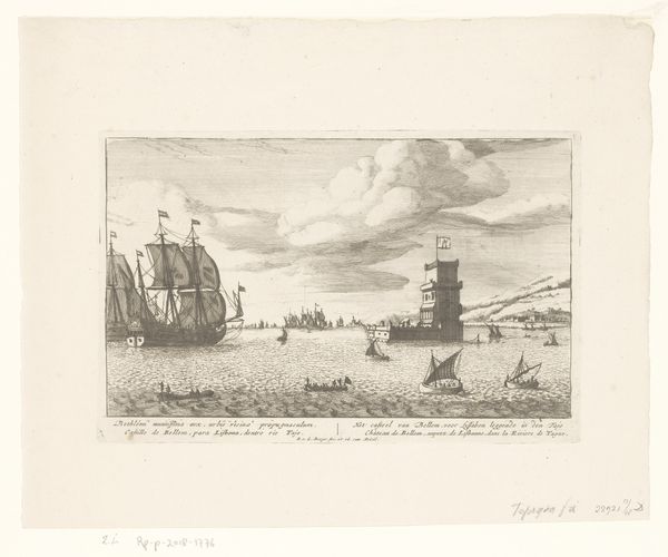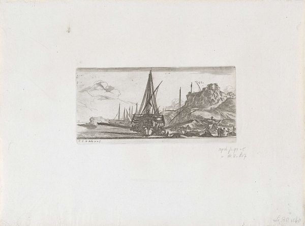 This is an etching called "View of the Coast of Italy" by an anonymous artist. In it, the artist uses a landscape format of horizontal lines that convey a sense of vastness and openness. The contrast between the dark foreground and the gradually lightening background, with the sky almost fading away, creates depth. The composition is arranged with a ruined tower on the left, balanced by the wrecked ship on the right. This formal structure is a visual dialogue between decay and endurance. The active scene in the middle, where figures gather near the shore, draws the viewer's eye, offering a narrative element amid the ruins. The use of etching allows for intricate detailing, enhancing the texture of the rocks and wood. Consider the semiotic implications of the ruined elements. Towers and shipwrecks could symbolize the transience of human achievement. The gathering of people near the shore also indicates the continuity of life amidst the relics of the past. These components invite us to ponder the cyclical nature of history, with the artwork serving not just as a depiction of a place, but as a commentary on civilization.