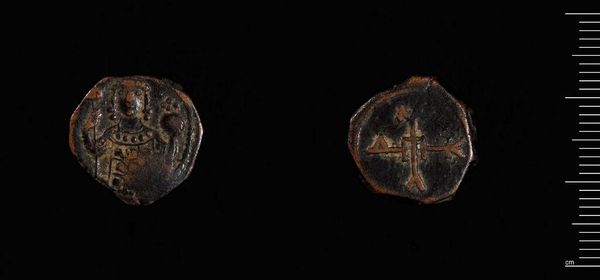 Curator: Looking at this copper coin, the "Assarion of John V" from the Harvard Art Museums, I can't help but feel the weight of history in its tiny, worn form. Editor: It’s so small! The immediate impression is of something incredibly intimate, almost secretive, whispering stories of a long-lost empire. Curator: It's striking how these symbols, stamped on such a modest object, were meant to project power. The image of the emperor and the religious iconography... Editor: Religious iconography always gets me. Even in this fragmented state, there is something powerful about the faith being projected out to the subjects of the empire. Curator: Indeed. And it's amazing to think about the sheer number of hands this little coin must have passed through. Editor: Yes, the journey it must have had is mind-boggling! It’s really lovely to think about the emotional weight such a small thing could carry throughout time. Curator: Absolutely. Its survival speaks volumes. Editor: A tiny talisman of time. I love that.