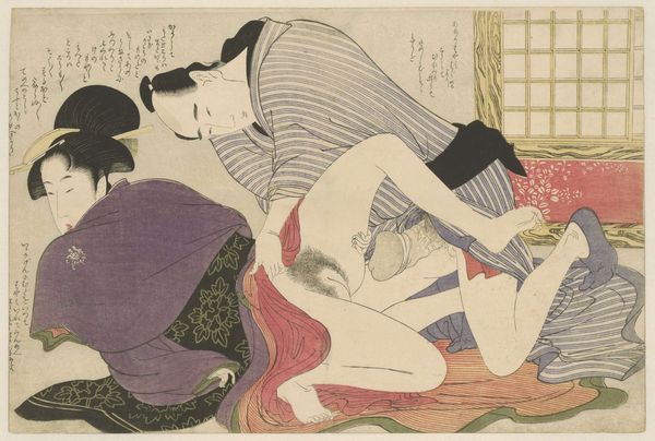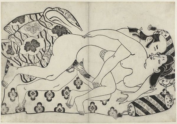 Editor: Here we have Hokusai's "Met gesloten ogen," created sometime between 1815 and 1823. It's a print using woodcut and ink. What strikes me most is the intimacy of the figures, yet also their passivity – everyone's eyes are closed. How do you interpret this work? Curator: Well, viewing this through a contemporary lens, we must address the cultural context of "shunga," erotic art, within which this print resides. Was it empowering, or exploitative, particularly for the woman depicted? Editor: That's a valid point. I hadn't considered it from that angle. The closed eyes... could that symbolize a lack of agency, or perhaps a retreat into pleasure? Curator: Precisely. Does the woman's apparent passivity reinforce societal expectations of female roles during that period, or does the depiction of pleasure offer a subversive reading against those norms? How do you think the male gaze operates here, considering that this piece was part of a larger consumer culture? Editor: I guess the commercial aspect complicates the idea of simple female empowerment. The act of selling such images – does that inherently objectify? Curator: That tension is key. "Shunga" prints were consumed by both men and women, cutting across social classes. The availability and acceptance of such imagery in 19th-century Japan challenges our modern sensibilities about censorship and representation. Can we impose our values, or must we consider it on its own terms? Editor: So it's not a straightforward narrative of oppression. The context creates so much more complexity. Curator: Exactly! Recognizing that complexity is crucial for a richer understanding, encouraging us to continuously interrogate the politics of pleasure and representation. Editor: I see it now, looking deeper than the surface is important and cultural and historical background bring a lot of depth to any piece. Curator: Yes! Nuance is really important when understanding artwork.