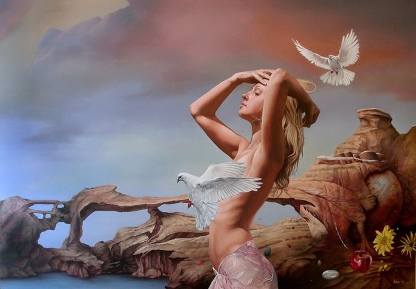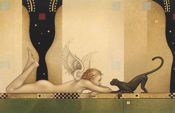 Michael Parkes' painting 'The Bath' presents a surreal scene rendered with meticulous detail and a subdued palette. The composition centers on a nude woman in a bathtub attended by a mysterious, blindfolded figure. This juxtaposition of classical form and bizarre imagery evokes a dreamlike atmosphere. Parkes destabilizes established meanings through his integration of fantastical elements. The tub itself, with its human face and animalistic feet, challenges conventional objecthood. This blending of human, animal, and inanimate forms creates a sense of ontological uncertainty, questioning the boundaries of identity and being. The smooth gradations of color and the precise lines contribute to a hyperrealistic effect, yet this realism is subverted by the irrational nature of the scene. The formal tension between detailed representation and surreal content underscores the painting's engagement with themes of perception, illusion, and the fluidity of reality, inviting ongoing interpretation.
