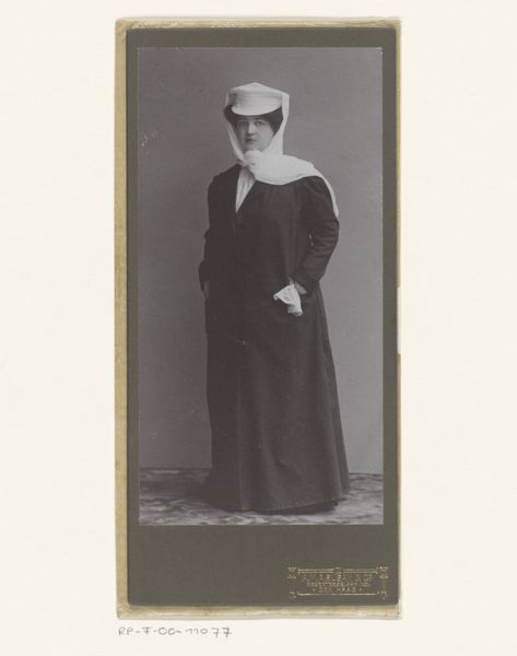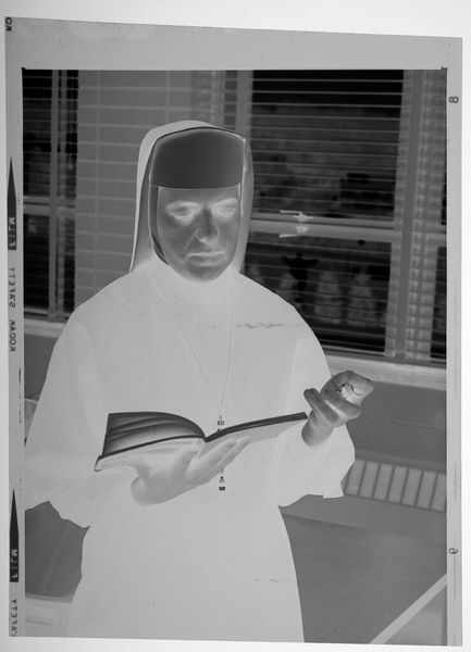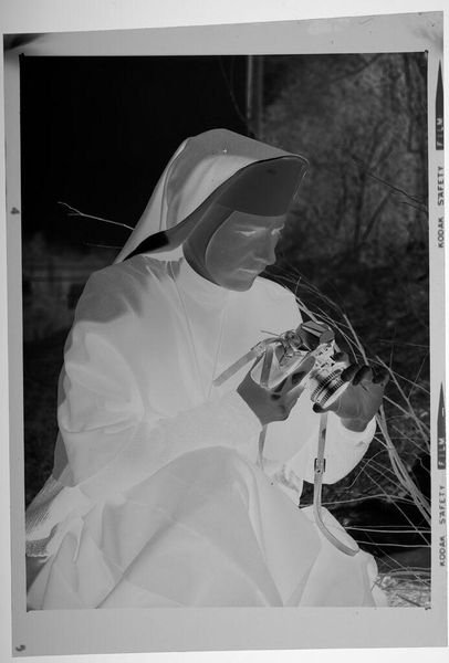 Curator: This intriguing image, currently held in the Harvard Art Museums, is an untitled photograph by Martin Schweig, depicting a nun examining 35mm negatives. Editor: It feels like a glimpse into a hidden world, doesn't it? The stark black and white and the nun's focused gaze give it a sense of quiet contemplation. Curator: Absolutely. Schweig captures this moment of a nun engaging with the tools of photography, blurring the lines between religious life and the technological advancements of the time. Consider the use of Kodak safety film evident in the image's border. Editor: The film itself becomes a symbol, a material representation of capturing and preserving moments. And the nun, in her traditional habit, juxtaposed with these modern negatives, invites reflection on faith and modernity. Curator: It speaks volumes about the social context, challenging conventional roles and exploring the intersection of labor, belief, and the very materiality of image-making. Editor: A captivating piece—the image and its implied narratives linger in the mind long after you've seen it. Curator: Indeed, it reveals how seemingly disparate elements can converge to create a powerful and thought-provoking visual narrative.
