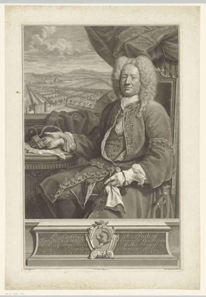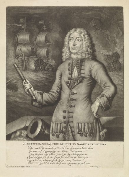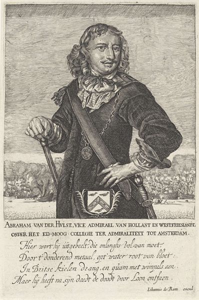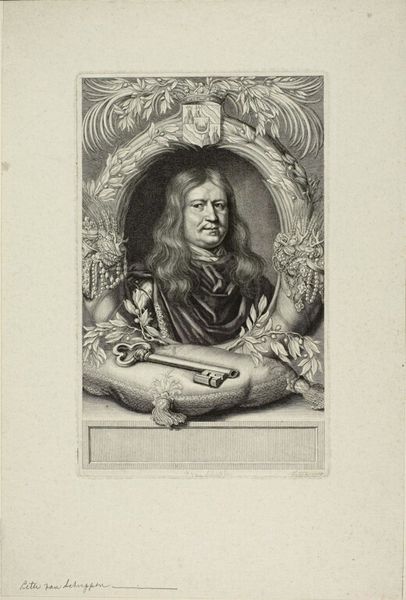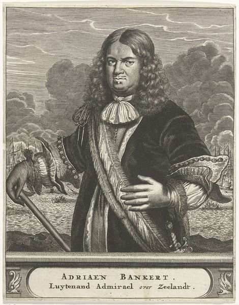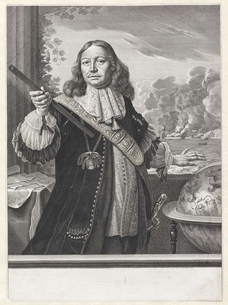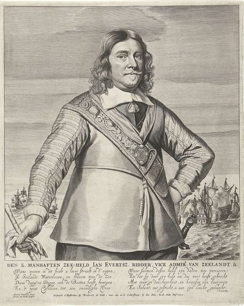 Curator: Here we have Arnold de Jode's portrait of Johan Evertsen, an engraving likely created before 1669, placing it firmly in the Dutch Golden Age. What strikes you first? Editor: Immediately, the construction itself. It's so formal and almost imposing, right? Look at the weight of that laurel wreath, contrasting with Evertsen’s direct gaze. It feels very deliberate in its attempt to communicate power and status in this Dutch historical context. Curator: Precisely! De Jode’s process is intriguing here. Engraving demanded a highly skilled hand, carefully translating texture and form with fine lines on a metal plate. You can see it in the detailing of the lace collar and the way light falls across his coat. Editor: And those details tell a story. Consider Evertsen’s role: a celebrated admiral. That scroll he holds – perhaps a map or orders? – speaks directly to his authority in maritime affairs, deeply linked to the economic and colonial expansions of the Dutch Republic at the time. Curator: It’s all so meticulously rendered. And the addition of the ships in the background. I would like to point that the symbolic inclusion of ships as signs of ongoing imperial trade and also violence, which needs to be acknowledged as part of any honest conversation about this portrait. Editor: I agree, and beyond the surface, we must acknowledge the labor involved. The engraver's skill wasn't simply technical. It was instrumental in shaping the image of authority, participating in the ongoing narratives of power, Dutch nationalism, and early-modern global economies. Whose stories were deemed worth recording, and whose were deliberately erased from this record? Curator: Good point! The portrait serves as a material testament to Dutch mercantile prowess, the power relations enacted through naval prowess, and the creation of a national hero—while carefully constructing narratives for public consumption. Editor: This engraving compels us to ask how identities and histories were, and still are, being carefully assembled. That’s a conversation worth having about power, representation, and historical narratives, isn’t it? Curator: Indeed, seeing it through this lens encourages questioning the choices inherent in visual representations, leading to a deeper understanding. Editor: Definitely something that brings greater resonance and more diverse perspectives.