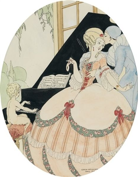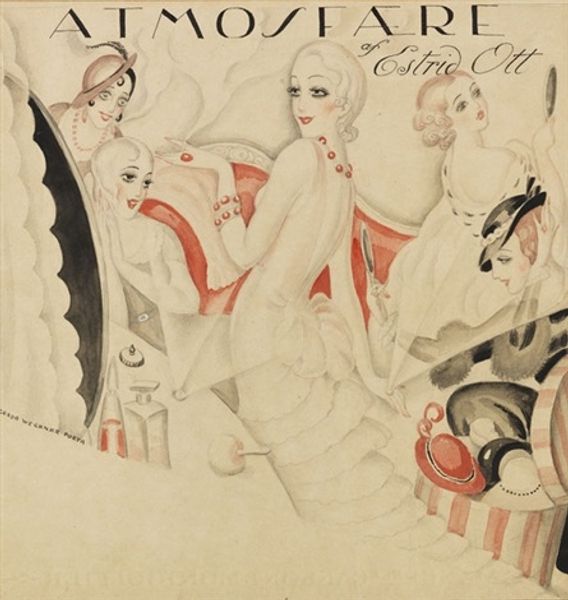 Editor: This watercolor drawing, “The Wings are Sewn on the Party Dress” is by Gerda Wegener, though the exact date is unknown. It has such an ethereal and subtly erotic atmosphere to it. What do you see in this piece? Curator: Indeed. Look at how Wegener layers symbols of transformation. The wings, obviously, speak to aspiration and perhaps a desire for escape from the self, but escape to where, and at what cost? Notice the mirror behind the woman, not reflecting her image but rather a point of light, an elusive ideal. Editor: So the wings aren't necessarily literal wings? Curator: They are representative, suggestive. Observe the figure at the bottom—Cupid, masked. What does it mean to veil love, to cloak its true nature? This piece may be reflective of shifting identities of Wegener and her partner. What do you make of the candle burning brightly next to what seem to be cosmetics or perfumes? Editor: Perhaps it represents fleeting beauty, soon to burn out, or a reminder that appearances are often constructed, carefully maintained, much like the angel-like image reflected back through the symbolism within the oval itself? Curator: Precisely! Wegener’s symbolism pulls from shared visual languages, immediately recognizable. Note how these details and images construct an emotional space that goes beyond mere portraiture and into something much deeper about the anxieties and thrills of performance. Editor: That is fascinating. It’s almost a secret language hidden within the art, isn't it? Curator: Yes! The party dress is as much of a disguise as it is a liberation. These details of dress, reflection and veiling hint at deeper complexities than might first be visible. Editor: Thank you. I hadn't considered how much meaning was packed into those small details, it really changes how I see the work.