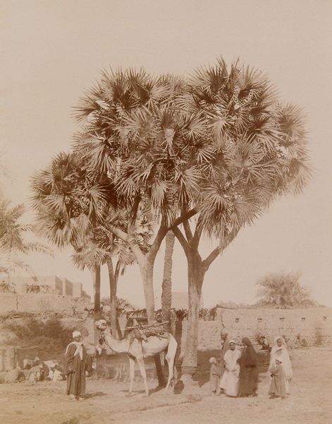 This photograph, titled 'Mensen onder dompalmen, Egypte,' or 'People under dom palms, Egypt,' was created by Antonio Beato in the 19th century. Beato, as a Western photographer operating in Egypt, stood at a complex intersection of cultural representation. His work was produced during a period of intense European colonial interest in the region. In this image we see a group of people resting under the shade of palm trees, accompanied by a camel. What does it mean to see this staged scene? It is a constructed image intended for European consumption, feeding into Orientalist fantasies of an exotic, timeless East. Beato's lens captures a moment frozen in time, but also raises questions about authenticity, power, and the gaze. How much did Beato’s presence and the very act of photographing impact the scene he documented? It prompts us to reflect on the power dynamics inherent in the act of representation.