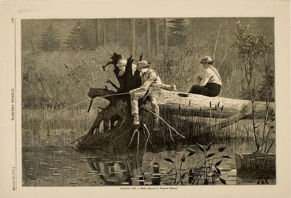 Editor: Here we have Theodor Kittelsen's 1900 graphite drawing, "Over Sjoe Og Elv," which translates to "Across Sea and River." There's something haunting about the scene. What do you see in this piece, particularly within its historical context? Curator: The stark imagery immediately draws us into the world of Norwegian folklore, reflecting a time when people's lives were deeply intertwined with nature and its inherent dangers. We see this reflected in the contrast between the praying figure, perhaps seeking divine intervention, and the figure engrossed in reading. Consider how literacy itself can be a form of power, or even resistance, within a community steeped in oral tradition and superstition. Who do you think these figures might represent, and what societal roles might they be playing? Editor: I’m wondering if the reading figure is a woman because of the hood and long dark coat and may indicate a wise woman or someone knowledgeable in folk medicine. The praying figure may be a representation of a conventional religious man, contrasting tradition with modernity. Curator: That's an insightful reading. Kittelsen often used folklore to explore social anxieties and comment on power dynamics. This seemingly simple boat ride can be interpreted as a journey through a landscape shaped by both Christian dogma and pre-Christian beliefs. Could the artist be suggesting a shift in authority, with the woman challenging patriarchal and religious structures? Or perhaps showing the tension and negotiation that inevitably happen with colliding perspectives? Editor: It's interesting how this drawing isn't just a snapshot but seems to capture the anxieties and cultural shifts of a whole era. The drawing resonates far beyond just a narrative of the past, though. I’ll remember this. Curator: Indeed, art like this can be seen as an important voice in our current political moment when people feel so fractured by ideologies. It asks important questions about ways forward and about the value and impacts of belief.