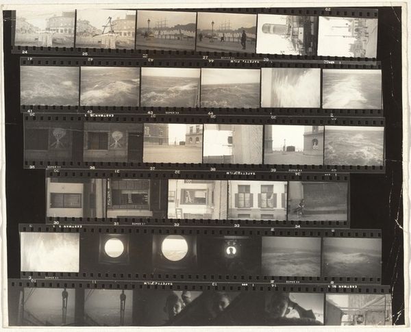 Curator: Let’s turn our attention to Robert Frank’s “Bullfight--Spain 16,” a gelatin-silver print from 1952. Editor: Immediately, I’m struck by its texture, by the raw, almost documentary feel of the celluloid strip. Each frame holds its own potential narrative. Curator: Precisely. It's important to understand Frank's broader project at this time. As an outsider documenting America and Europe, he critically explored cultural performances. Bullfighting, here, becomes a charged symbol, linked to displays of masculinity, and traditional Spanish identity. It carries post-war, post-colonial implications of domination, class, and spectacle. Editor: I see it more as an experiment in visual sequencing. Frank arranges diverse images together—bullfights, landscapes, portraits—forcing connections, echoing, and contrasting the themes. There’s a definite formal structure, one defined by its imperfections and graininess. Curator: The composition within individual frames certainly plays a role. The way Frank crops and frames offers subtle commentary, and invites analysis. Is he romanticizing this practice, or pointing to the violence implicit in this national ritual? Editor: The de-saturated tones across this gelatin-silver-print invoke a sense of faded glory or perhaps underlying morbidity, giving an aura that blends historical document with poetic meditation. But overall, I find its formal organization most compelling. Look how this array presents a rhythmic and visual syntax, a type of storytelling. Curator: To me, it reflects how cultural traditions can function, at once visually alluring, yet raising fundamental questions about our relationship with nature, and each other. This relates directly to gendered power dynamics deeply ingrained into societies. Editor: While I understand how identity factors in, the power lies in the juxtaposition of its visual vocabulary. This allows me to weave together meaning that I might not see within the single frame. Curator: Considering its many angles and themes, its visual layout creates new avenues of discussion, questioning the art and life connection. Editor: Indeed, offering room to think, feel, and visually dissect the artist’s way of viewing this moment in history.