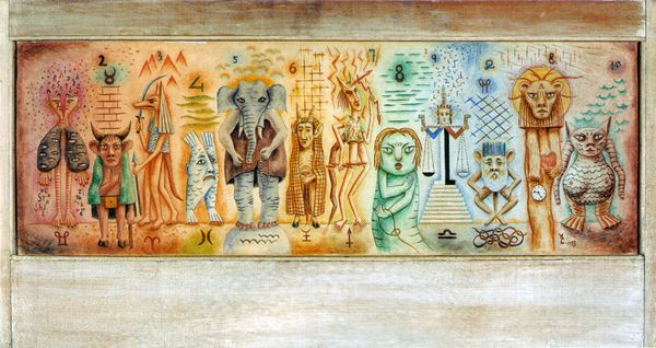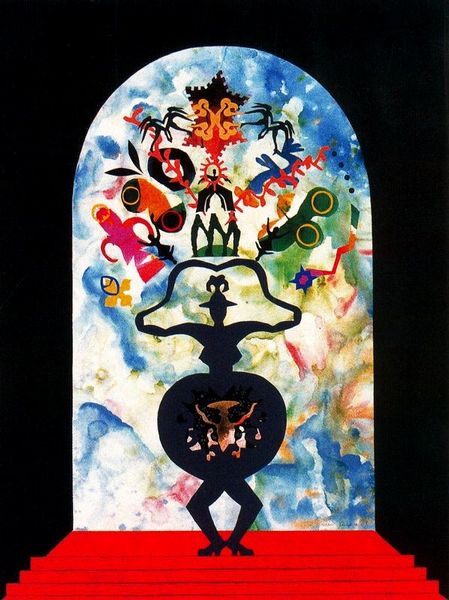 Editor: Miriam Schapiro’s mixed-media piece, "We Live in Her Dreams", bursts with figures. It's vibrant and lively, but also a bit chaotic with the way everything's arranged, sort of like a complex collage of symbols and shapes. What stands out to you in its composition? Curator: Formally, the composition uses high-key color contrasts to create an energetic, almost dizzying visual field. Notice how the central triangle acts as a point of stability, yet its stark whiteness intensifies the surrounding chromatic activity. How do you interpret the relationship between this central form and the outlying figures? Editor: I hadn’t considered the triangle like that, a stabilizer. The outer figures, almost primitive in style, seem to dance around it, maybe hinting at different cultural references? Curator: Precisely. The juxtaposition generates visual tension, prompting an analysis of the work’s structure rather than focusing on singular narratives. Consider also Schapiro’s handling of texture. What does it suggest to you? Editor: There’s a collage effect with the layering, so that brings a depth, making you wonder what elements are meant to recede or advance. It does bring out a tactile dimension within the work, even if it's a flat picture. Curator: Yes, this emphasis on layering underscores a dialogue between surface and depth. It subverts conventional notions of pictorial space. By using these different applied textures and bright clashing colours the composition seems like a discourse of various artistic languages interacting. Editor: That makes me see it with fresh eyes, I was caught up in decoding all those figures individually, I really like the point about the art languages now, thank you. Curator: You are most welcome. Understanding the elements helps appreciate its unique discourse of visual interactions.