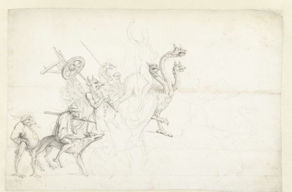 Curator: This is Charles Rochussen's pencil drawing, "Twee ruiters en een liggende man," which translates to "Two Riders and a Lying Man," created somewhere between 1840 and 1860. You can find it here at the Rijksmuseum. Editor: It feels like a fleeting thought, doesn’t it? A momentary vision sketched in haste. The sparse lines give it such an ephemeral quality. Curator: Absolutely. Rochussen captures a dynamism that’s characteristic of the Romantic period, though it's more like a whisper of action than a grand statement. What do you make of the figures themselves? Editor: The two riders appear almost jaunty, despite what seems to be happening with the fallen figure on the left. The horses have this frantic energy, a sense of urgent escape. Curator: He seems to be gesturing as the riders move away from him. It reminds me a little of battlefield scenes from that era – but also it is like a rejected idea from an old Western! Do you see something particular in the use of light here? Editor: It’s almost entirely devoid of strong contrast. Everything's rendered with a similar soft gray, creating an atmospheric haze. It obscures the specific narrative and emphasizes a kind of… dreamlike state. Is this common for similar sketchbooks from this period? Curator: Exactly. That lack of specificity allows viewers to project their own narratives onto it. And within Romanticism, memory and emotion are often veiled rather than laid bare. Think about how the soft rendering also lends the figures a spectral presence. Editor: Perhaps it evokes that liminal space between waking and sleeping, the moment when impressions are strongest and logic loosens. Curator: Right – so maybe we are free to imagine who these men were, why one is on the ground—dead or alive—or just how romantic this encounter should feel to us. Thanks to the minimal pencil work and open-ended drama, "Two Riders and a Lying Man" makes its mark as a masterwork of understated poignancy. Editor: Indeed, an unforced glimpse into an artist's visual musings from the nineteenth century! I won’t soon forget it.