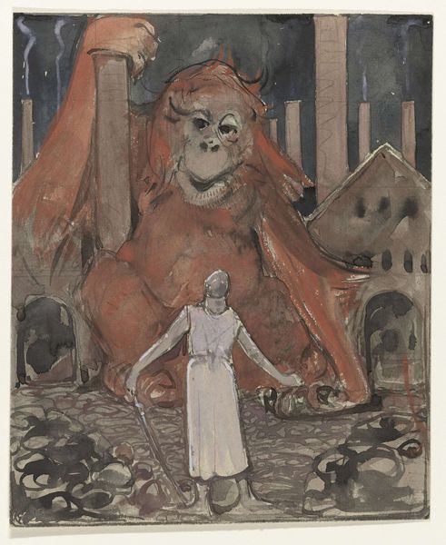 Editor: This is Artuš Scheiner's illustration for Božena Němcová's Fairy Tales, done in watercolor. It feels both whimsical and a bit unsettling, a scene of devils seemingly being entertained by a human. What strikes you most about this image? Curator: The charm of this illustration lies in how it domesticates the demonic. Notice the setting – almost a cozy interior, more stage than inferno. Scheiner, like many artists of his time, taps into folklore to address deeper cultural anxieties. Fairy tales served as vehicles for moral instruction, but also for negotiating complex social relationships. Think about the politics embedded in these narratives – who gets to tell the story, whose values are promoted? Editor: That makes sense. So, you're saying it's not just a scary picture but reflects something about societal power structures? Curator: Exactly. Look at how the human figure interacts with the devils – there's almost a master-servant dynamic. Is this an inversion of power, a critique of authority? Or does it reinforce existing hierarchies through cautionary tales? Moreover, it speaks volumes about cultural perceptions of outsiders and 'others'. How are these demons visually coded to elicit particular responses from the viewer? Are we meant to fear them, pity them, or laugh at them? Editor: That’s fascinating. I hadn’t considered how much social commentary could be packed into a fairy tale illustration. Curator: Scheiner’s work provides a glimpse into the public role of art. These images were not simply decorative; they actively participated in shaping cultural beliefs and social norms. It is very interesting to think of them that way! Editor: I'll definitely look at fairy tales and illustrations differently from now on. Thanks for the insight! Curator: My pleasure! I hope I was able to give you more understanding and I hope you consider that power structures are important even in seemingly frivolous pictures.