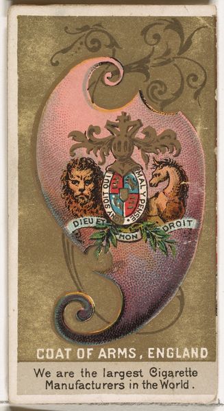This is a lithograph of Alexander III's coat of arms, part of a series produced around the turn of the 20th century by W. Duke, Sons & Co. Immediately striking is the symmetrical composition. A double-headed eagle dominates the center, rendered in warm browns and golds that contrast with the cooler gray-green background. Above, the crown is encircled by laurel; below, the shield displays a knight, all framed within a decorative pink ring. The graphic quality of the lines and flat planes of color suggest the mechanical reproduction typical of commercial printing. The juxtaposition of imperial symbols with an advertisement reveals a tension between power and commerce. The image’s structure and clarity can be understood within the broader context of late 19th-century visual culture, where standardized imagery played an increasingly important role in shaping public perception. Notice how the repetitive patterns and simplified forms create a powerful visual statement despite its small scale, underscoring the complex interplay of art, industry, and ideology.