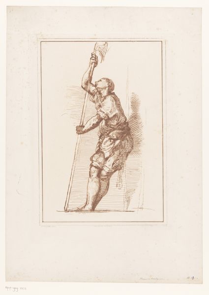 This drawing of a standing French soldier was made by August Christian Hauck, likely in the late 18th century. The drawing is created with graphite, or a similar material. The artist has rendered the figure with precision and delicacy. Look closely and you’ll see the attention given to the subject’s uniform and weaponry. The image reminds us that while the soldier may appear as an individual, he is also representative of a much larger, bureaucratized system. His clothing and tools are the products of mass manufacture, requiring complex economies of supply and demand. In this way, the drawing connects to wider social issues of labor, politics, and consumption. Ultimately, this artwork invites us to consider the relationship between the individual and the collective, the hand-made and the machine-made, challenging distinctions between fine art and the industrial system.