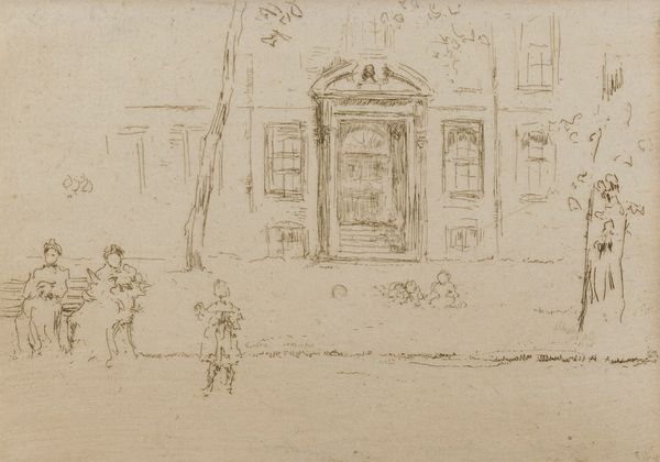 Curator: This is James Abbott McNeill Whistler’s "Village Shop, Chelsea," a watercolor executed between 1883 and 1884. Editor: My first impression? A muted snapshot of everyday life, almost ghostly. The colors are so subdued, like a memory fading at the edges. I immediately want to know, what was Chelsea like then? Curator: Chelsea was undergoing rapid social change at that time, a shift visible even in Whistler's choice of subject. The working class neighborhood slowly transitioning. Editor: You see the transition, but what jumps out to me is the artist's process. The thin washes of watercolor reveal a tangible, unedited handling of the material, as if the very act of painting were as important as what was being represented. The materiality speaks volumes, don’t you think? The social and the art-making become inseparable in how we consider art in culture. Curator: I do, but I think its value also lies in its snapshot of Victorian London. It provides insight into how urbanization impacted everyday interactions in spaces designed around commercial activities. Whistler, an American abroad, documents this shift which tells us much about what constituted “Englishness” for outsiders like Whistler, during the expansion of the Empire. Editor: Exactly! And you see how the medium itself facilitates that reading? Watercolors, often associated with quick sketches or preliminary studies, when instead here it encapsulates a changing world, it forces a reconsideration of both the artistic technique, but the place in art history in how such watercolor pieces are valued by audiences and the art market alike. Curator: Certainly. But I'm struck by how the subtle color palette and the soft focus create a sense of nostalgia, evoking a particular mood that only intensifies over time. This nostalgic appeal likely contributed to its warm reception among Victorian-era art collectors, eager to display such slices of modern British life in their galleries. Editor: The work provides not just visual data on London's urbanization, but forces a discussion on watercolor as an acceptable means of artistic exploration and expression and even, commentary. It offers insight to both how a world changes materially, as much as how its depiction solidifies how the artist chooses his tool of expression. It becomes inextricably intertwined. Curator: An interesting way to summarize a nuanced painting like this one. Editor: Indeed, it showcases the everyday while demanding attention to art's inherent ability to act as a product of—as much as a commentary of—historical forces.