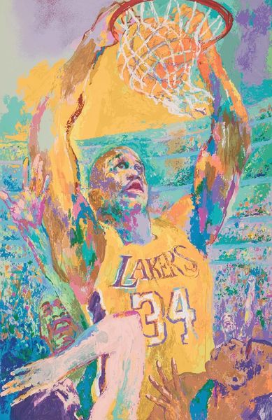 This is a painting of the New York Knicks versus the Boston Celtics, made by LeRoy Neiman with these really juicy strokes, kind of like he's sketching with paint. I love how Neiman doesn't get bogged down in details; it's all about capturing the energy of the game. Look at the way he uses color – these bright oranges and greens that bleed into each other, creating a sense of movement and excitement. The surface is alive with texture, like he's wrestling with the paint to get it just right. My eye keeps getting drawn to the basketball itself, how it’s rendered with these thick, almost sculptural strokes. It’s not just a ball, it’s a focal point, a symbol of the game's dynamism. It makes me think of someone like Joan Mitchell, in how both artists share this love of gestural abstraction, where the act of painting is as important as what's being depicted. It's a reminder that art isn't about perfect representation, it's about capturing a feeling, an emotion, a moment in time.